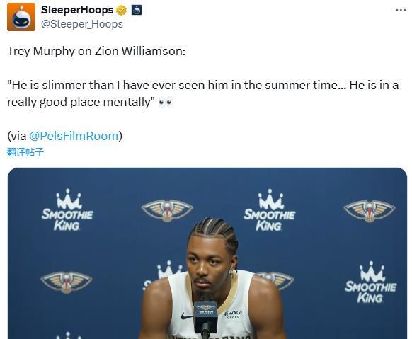 谈到队友锡安的体型,特雷-墨菲说道:他比我以往夏天见过的任何时候都要瘦,他的精神状态也非常好。